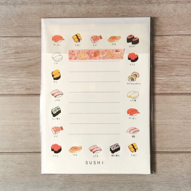便箋にも封筒にもお寿司のイラストを散りばめています。見た人がワクワクした気持ちになるといいなと思ってデザインしました。