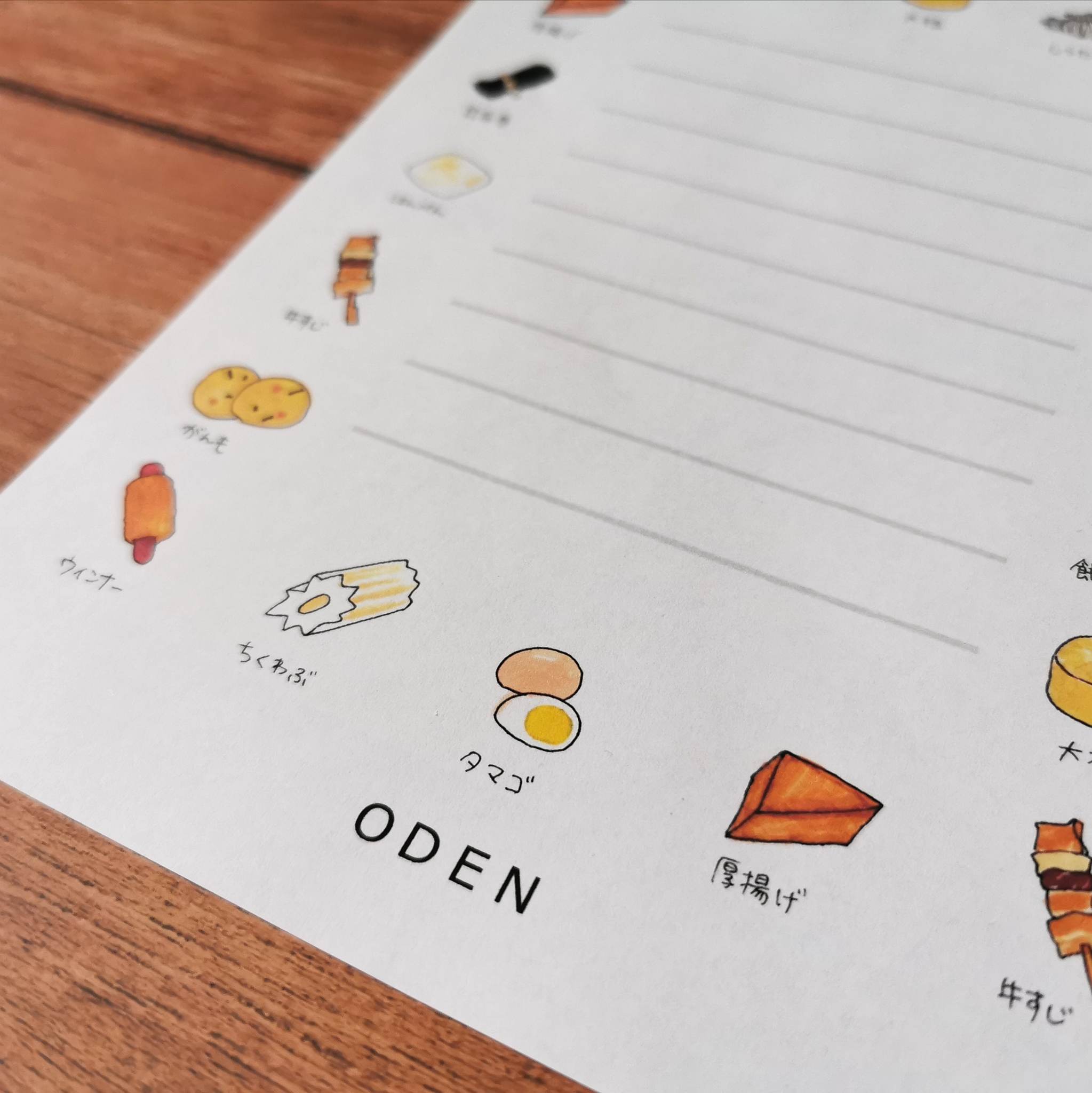 便箋にも封筒にも、おでんの具のイラストを散りばめています。身近にあるコンビニおでんの具もあります。
