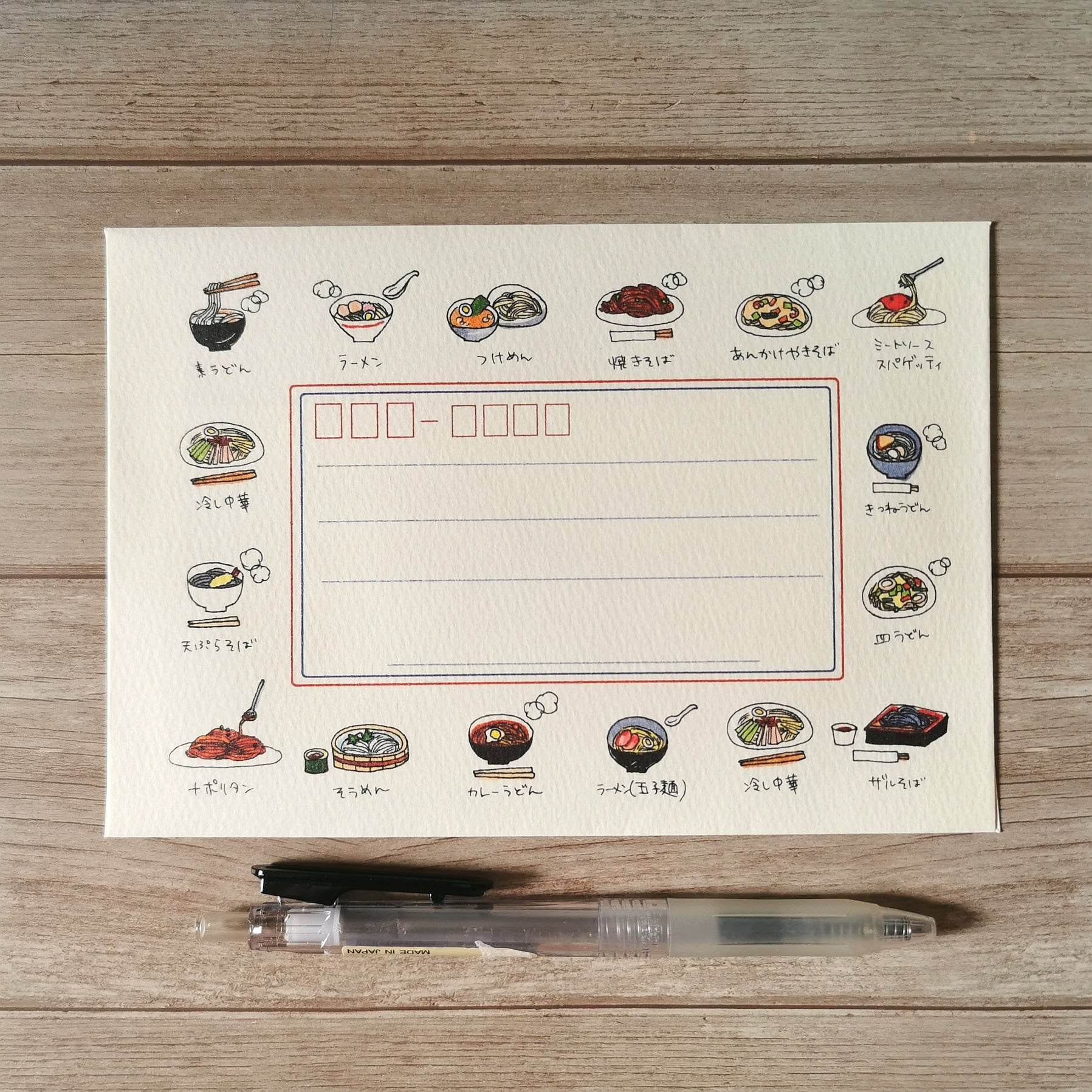 便箋にも封筒にも、温冷問わず色んな麺類のイラストを散りばめています。