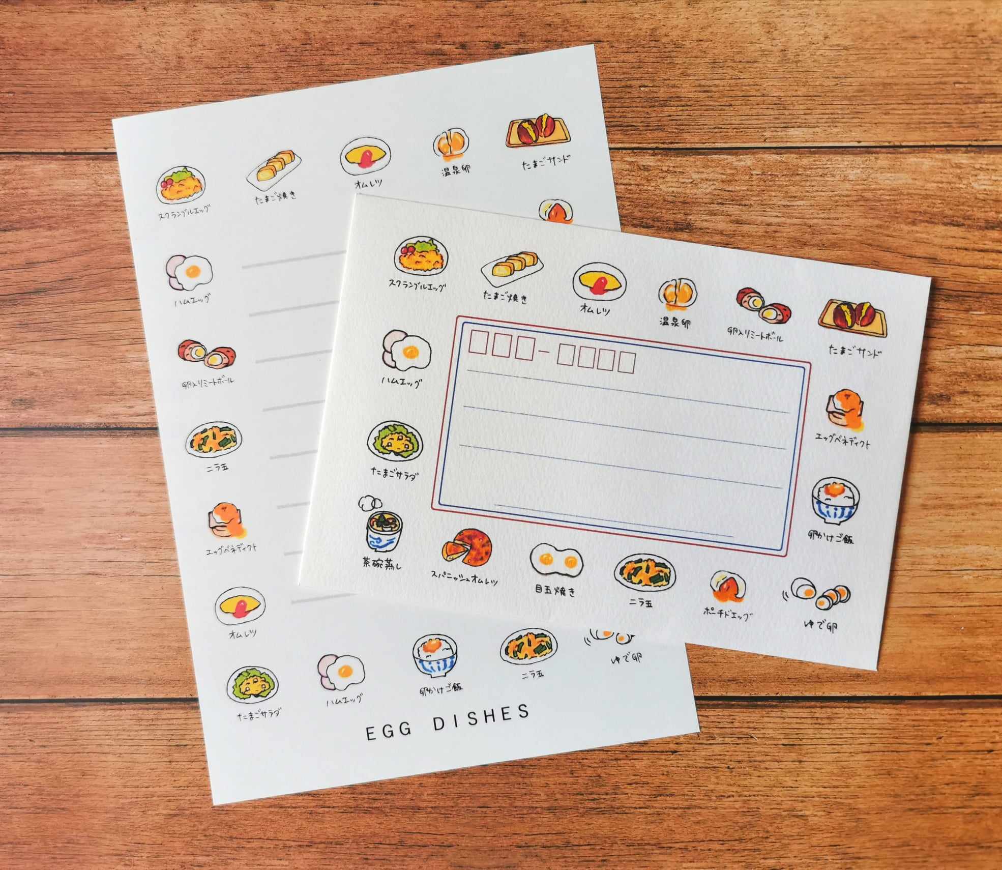 便箋にも封筒にも、卵料理のイラストを散りばめています。見た人がワクワクした気持ちになるといいなと思ってデザインしました!
