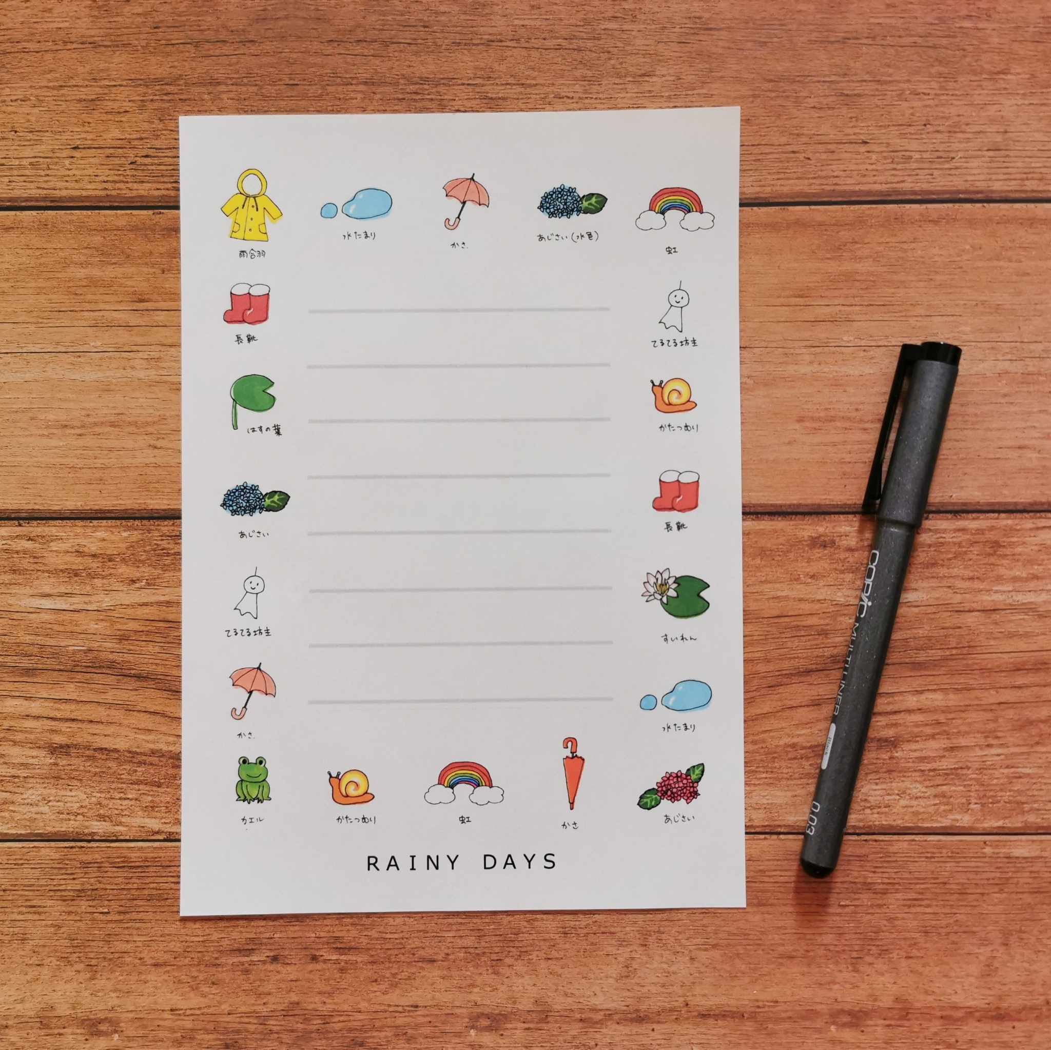 どんな雨の日でも良い日になりますように。雨にまつわる手描きイラストをレターセットにしました^^